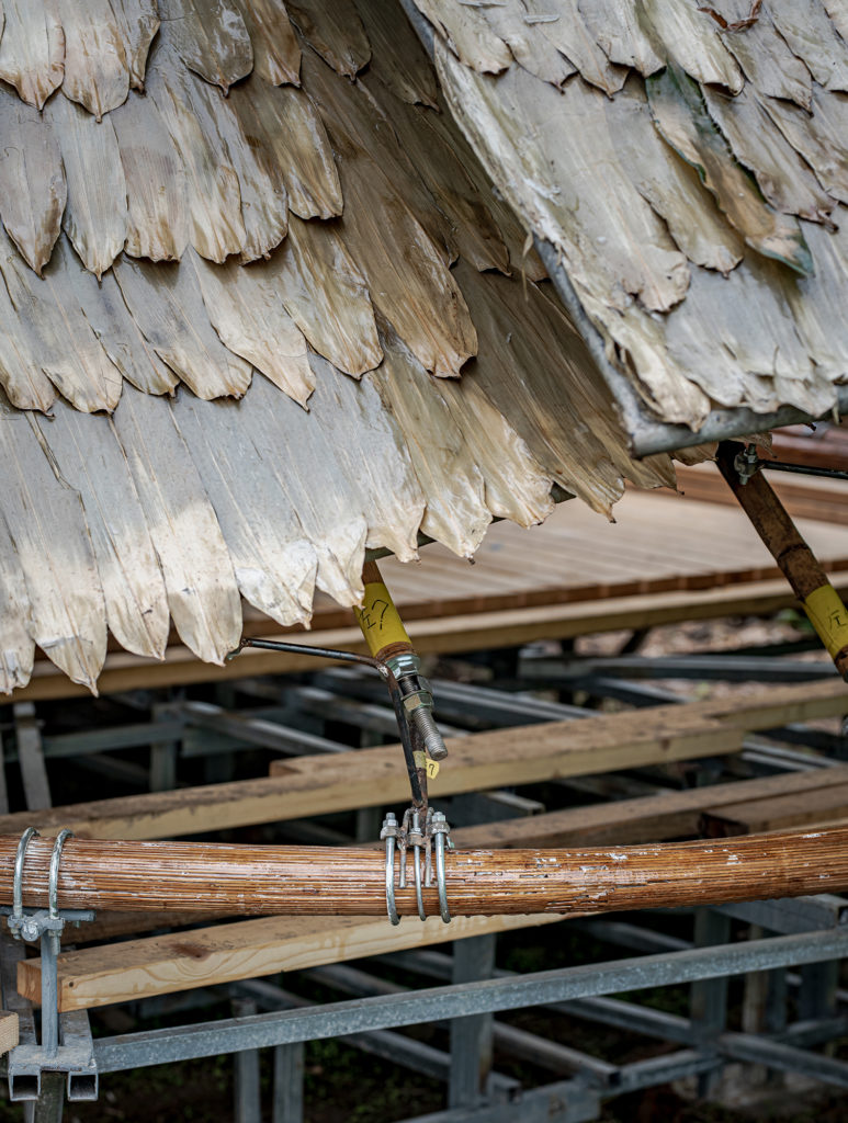 以螢火蟲聞名的無人招呼站又名螢河鐵道。每年4、5月的時候,遺世獨立的場景總是變得如夢似幻。因此、在失去候車功能的鐵道側,我們試圖構築一處等候場所,做為等候夜晚來臨的「月之台」。如同動畫《となりのトトロ》下雨場景中,龍貓頭上的蜂斗菜葉(フキ),其葉子的緣側線條、或山林間隨處可見芋葉都有著與竹相同,柔韌、輕盈的特色。利用連續起伏的拱,構築出高低起伏的型態,輕觸於車站與大楠木間的空地,讓停留的人在微風吹拂、落雨聲、溫柔的光影,或等待螢火蟲出沒時,衍伸出親密的空間感受。